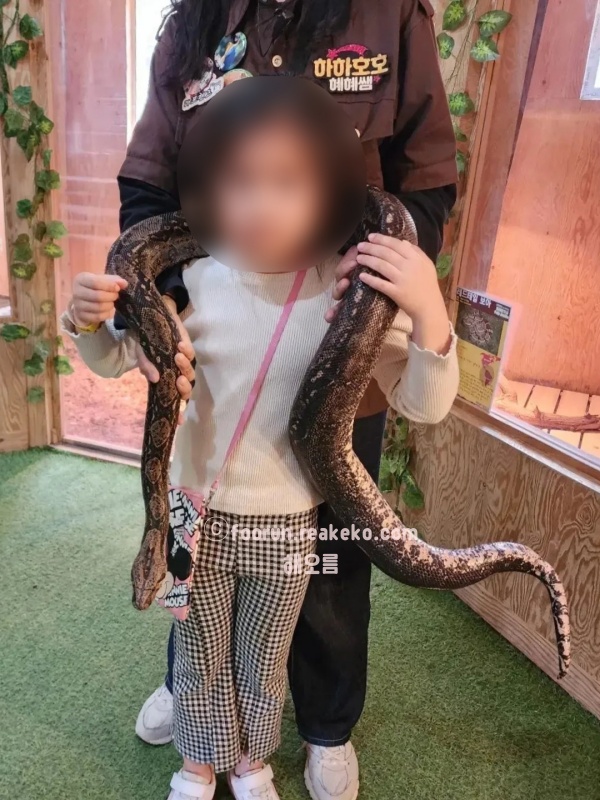 실내 체험존에서는 뱀, 도마뱀, 친칠라 등 다양한 동물을 직접 만져볼 수 있으며, 사육사의 안내에 따라 진행됩니다. 동물들은 매우 온순했고 초원을 거닐며 자유롭게 풀을 뜯는 양들을 보는 것만으로도 평화로움을 느꼈습니다.