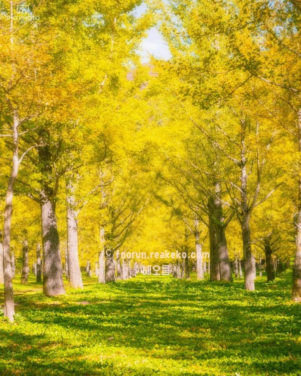 은행나무들이 노랗게 물들면 숲 전체가 황금빛으로 변하며, 바람에 떨어진 은행잎들이 바닥을 덮어 멋진 풍경을 연출합니다. 숲을 천천히 걸으며 사진을 찍기에도 좋고, 숲 속에 흐르는 계곡물은 맑고 깨끗해 자연의 아름다움을 더욱 돋보이게 합니다.