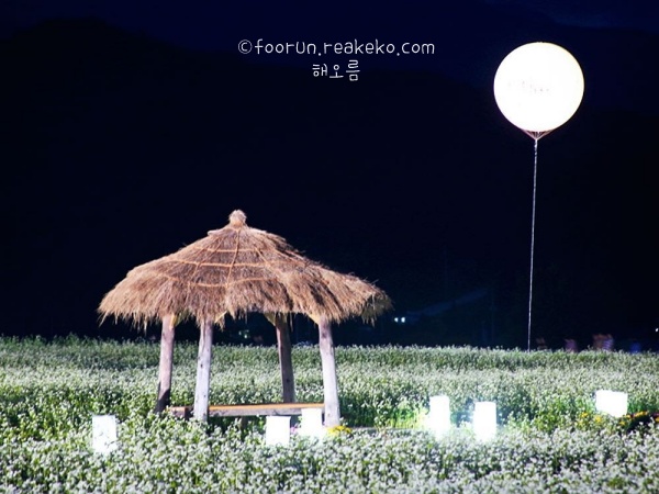 1박 2일 가을 여행지 추천 평창입니다. 평창 효석문화제 축제장에서 가장 인상 깊었던 것은 새하얗게 펼쳐진 메밀꽃밭이 주는 고요한 아름다움이었습니다. 저녁에는 메밀꽃밭을 둘러싼 조명이 켜져 낭만적인 분위기가 더해졌고, 이효석의 문학 세계에 깊이 빠져드는 시간을 가졌습니다.