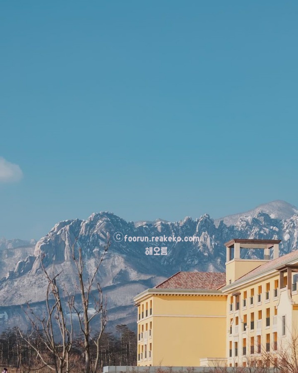 한화리조트 설악 쏘라노는 유럽풍의 건축물과 아름다운 자연 경관으로 사랑받는 겨울 속초 가볼만한곳 베스트 10으로 겨울철에는 설악산의 설경과 함께 리조트 주변의 고즈넉한 분위기가 좋아 연말연시 새해 여행 갈만한 곳으로도 좋고, 리조트 내 호수공원 산책로를 따라 산책하며 겨울 풍경을 감상할 수 있었습니다.