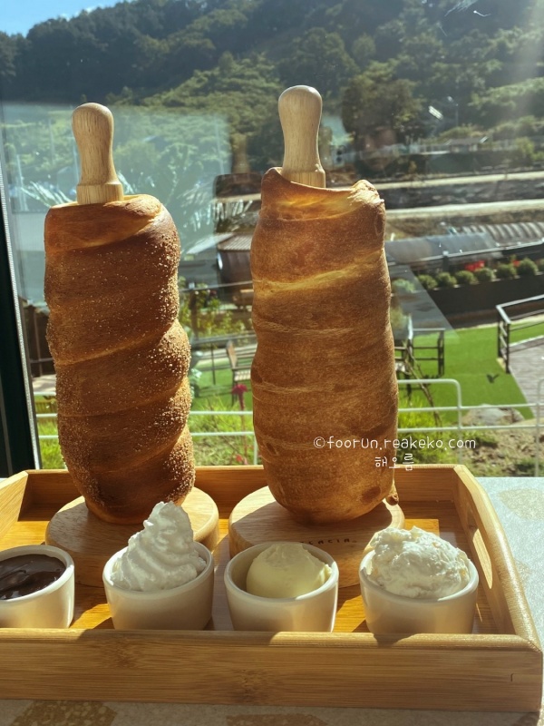 팔뚝만한 체코 전통 굴뚝빵이 있는 대형카페로 청주에서 1시간이면 도착하는 청주 근교 카페입니다. 이색 메뉴 굴뚝빵이 핫한 옥천 가볼만한곳 베스트 10곳으로 시그니처 굴뚝빵은 체코 전통 빵입니다. 따뜻하게 먹을 수 있게 주문 즉시 구워주고 시나몬슈가, 오리지널 빵 중 선택 가능하고 소스도 생크림,누텔라초코,사과잼생크림 중 취향에 맞게 원하는 소스로 고를 수 있습니다.
