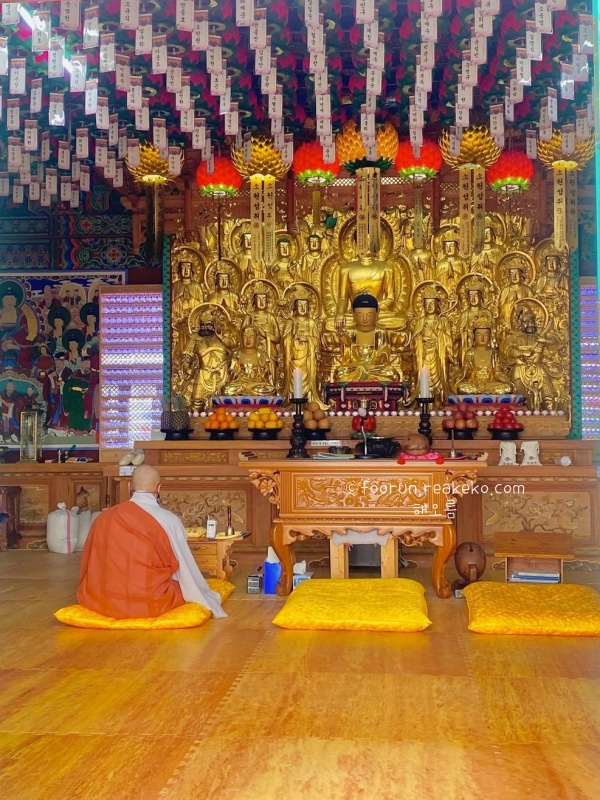 용암사에는 다양한 꽃과 나무가 심어져 있어 사찰의 경치를 더욱 아름답게 만들어줍니다. 자연 속에서 명상에 잠길 수 있어 일상에서 벗어나 평온함을 느껴봅니다. 대웅전에는 아미타여래를 중심으로 관세음보살과 대세지보살의 삼존상이 봉안되어 있으며, 대웅전 근처에는 범종각도 자리 잡고 있어 사찰의 전통적인 분위기도 아주 좋습니다.