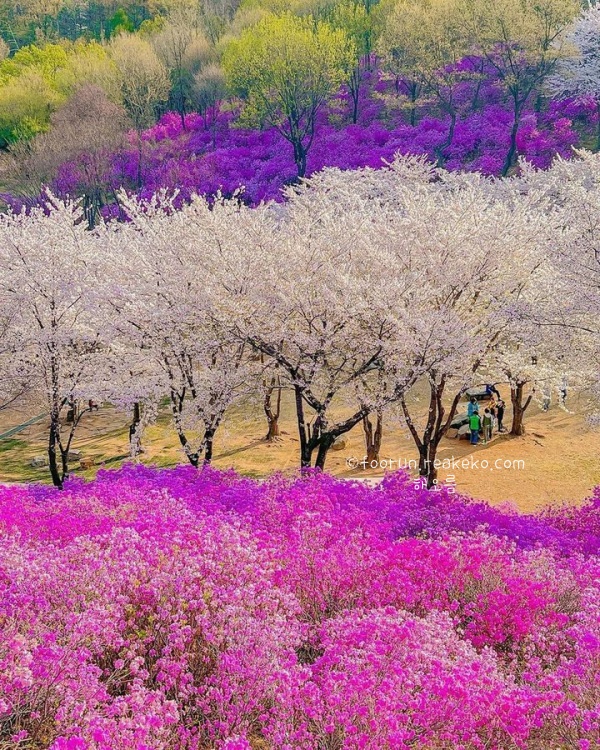 원미산은 3월 말이 되면 분홍빛 진달래로 뒤덮인다. 평소에는 소박한 숲길 같은 분위기지만, 이 시기만큼은 산 전체가 색을 입은 듯한 느낌이다. 산책로를 따라 걸어가다 보면, 꽃잎이 바람에 흩날리며 옷자락에 내려앉고, 사람들은 저마다 사진을 찍기 바쁘다. 산 정상 부근에 오르면 부천 도심이 한눈에 내려다보이는데, 도시와 분홍빛 산길이 대비를 이루는 풍경이 경기도 3월에 여행하기 좋은곳으로 추천할만하다.