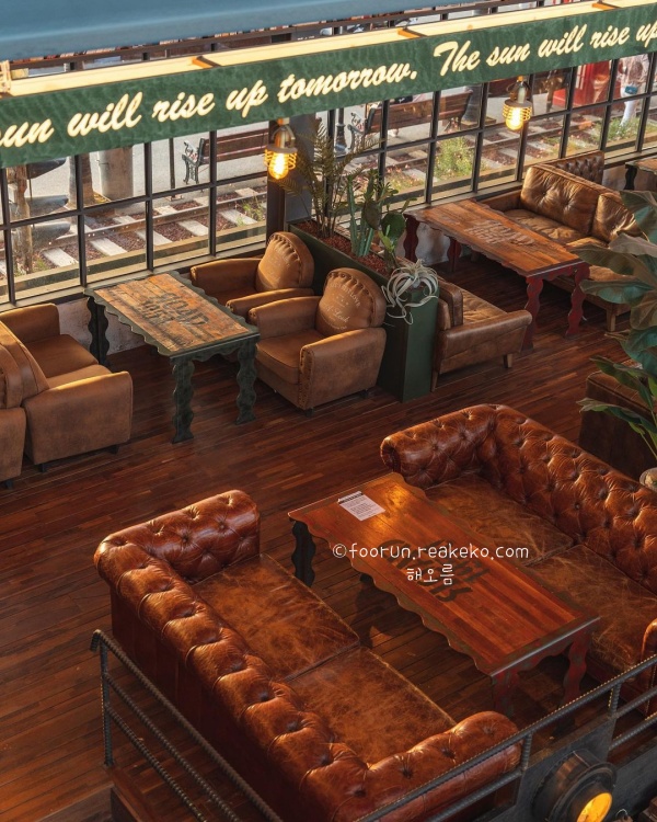카페 외관부터가 이국적이다. 유럽 감성의 힙한 외벽을 지나 내부로 들어서면, 이곳이 카페인지 화보 촬영장인지 헷갈릴 만큼 공간이 잘 꾸며져 있다. 당진 비오는날 가볼만한곳 베스트 10으로 실내는 높은 천장과 넓은 창 덕분에 개방감이 좋고, 공간마다 다른 컨셉으로 꾸며져 있어 구경하는 데만도 시간이 훌쩍 간다. 바 테이블, 소파석, 원목 테이블, 그리고 바다를 마주보는 창가석까지 자리를 고르는 재미도 꽤 쏠쏠하다.