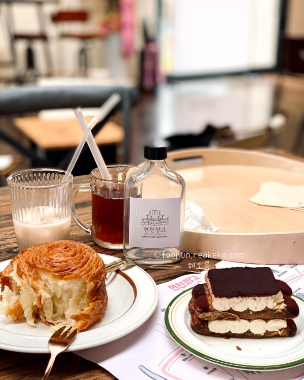 안으로 들어서면 높은 천장이 먼저 시야를 압도한다. 노출된 기둥과 목재 인테리어가 어우러져 건물 자체가 전시물처럼 느껴지기도 하고, 전 좌석이 편안한 쇼파로 되어 있어 앉아 있는 시간이 전혀 부담스럽지 않다. 날이 좋은 날엔 야외 테라스도 개방되어 있는데, 한 바퀴 면천 골목을 돌아보고 이곳에 앉아 쉬는 흐름이 꽤 괜찮다.