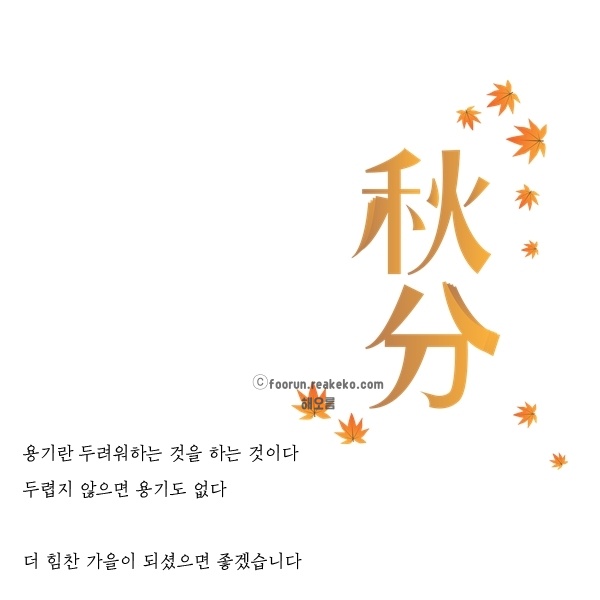: 낙엽이 지는 걸 슬퍼하지 않고, 자연스럽게 아름다워지는 것으로 바라보는 이 문장이야말로 추분에 딱이에요. 이제부터는 화려한 여름이 아닌, 성숙한 아름다움이 시작됩니다.